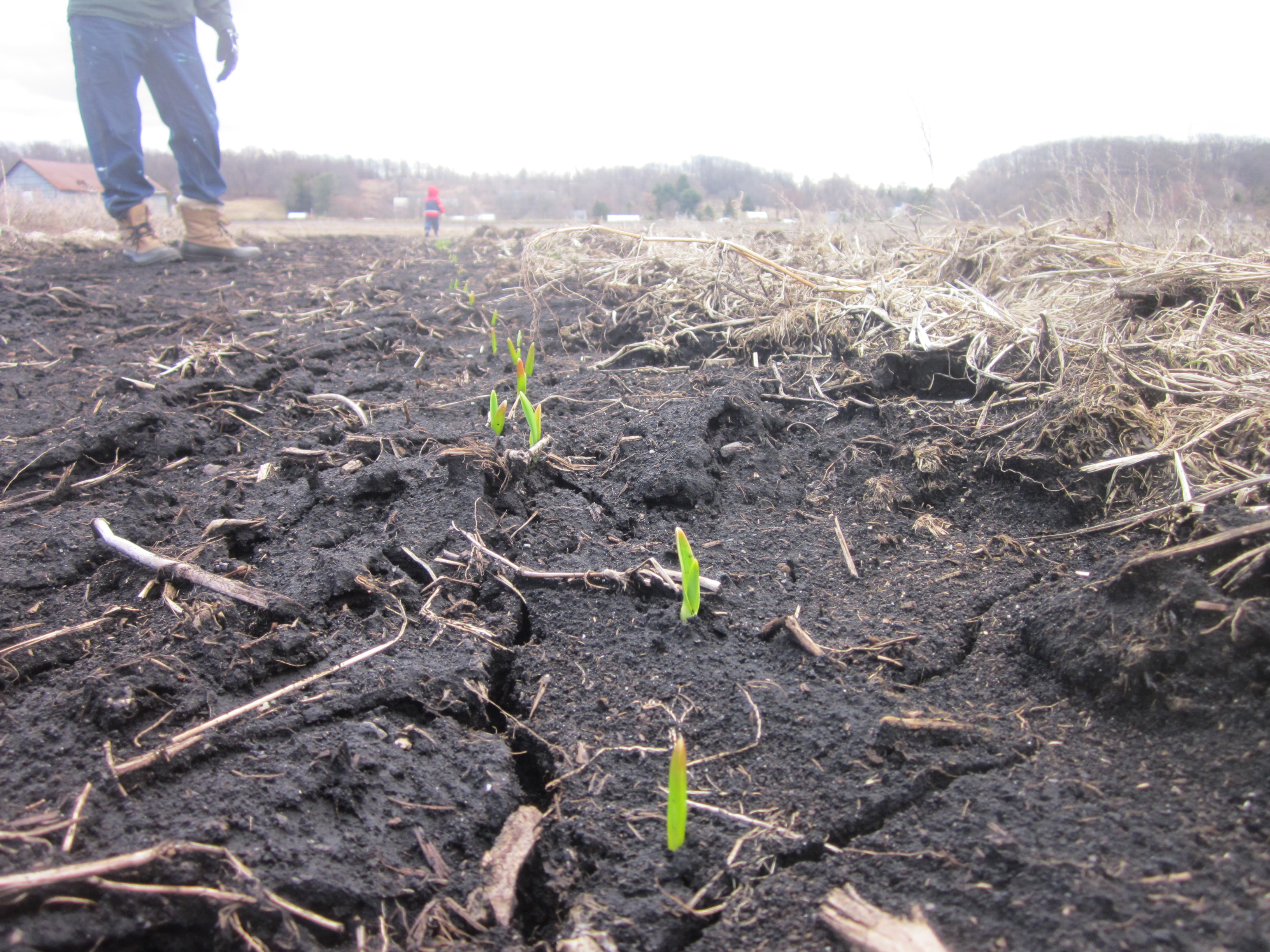 You can see evidence of autumn labor with garlic shoots breaking through. This was garlic planted on a whim, when I spotted forgotten hardneck garlics that looked like it had spilled from a crate by the barn. I wasn’t sure the garlic would survive the epic low winter temperature that might have brought us from zone 6a (average minimum extrememtemperature -10 to -5 Fahrenheit) to 10 degrees BELOW that. 2 weeks ago there was nothing, now the shoots have broken ground!