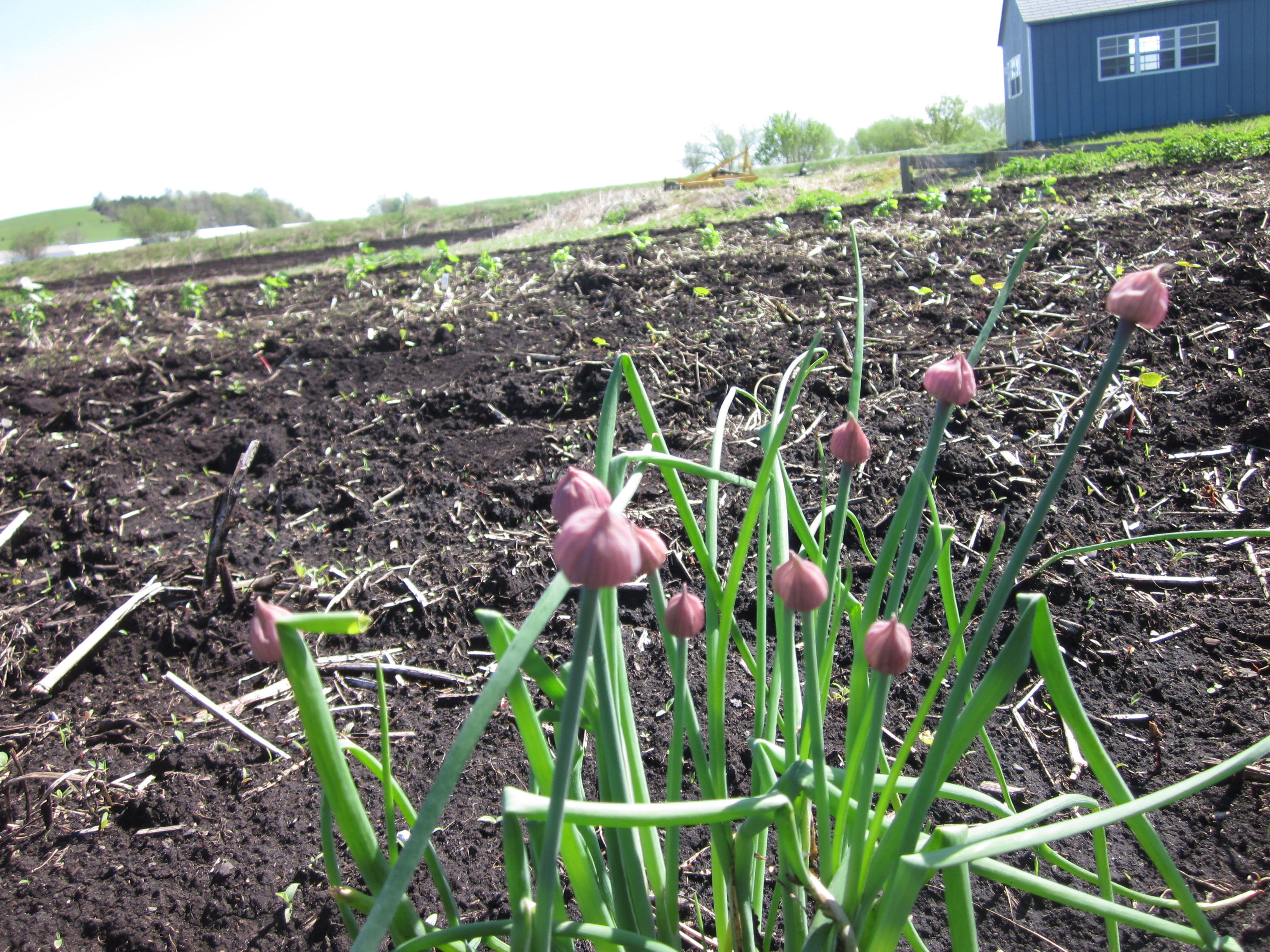 It took a whole day of working before I noticed the chives about to flower. I harvested 3 plants to within 2 inches from the ground, uncertain exactly whether the leaves will grow back, yellow, or what. Since we have a whole row of these, I expect to make a whole lotta chive dishes next week. I can smell the chive cream cheese already.