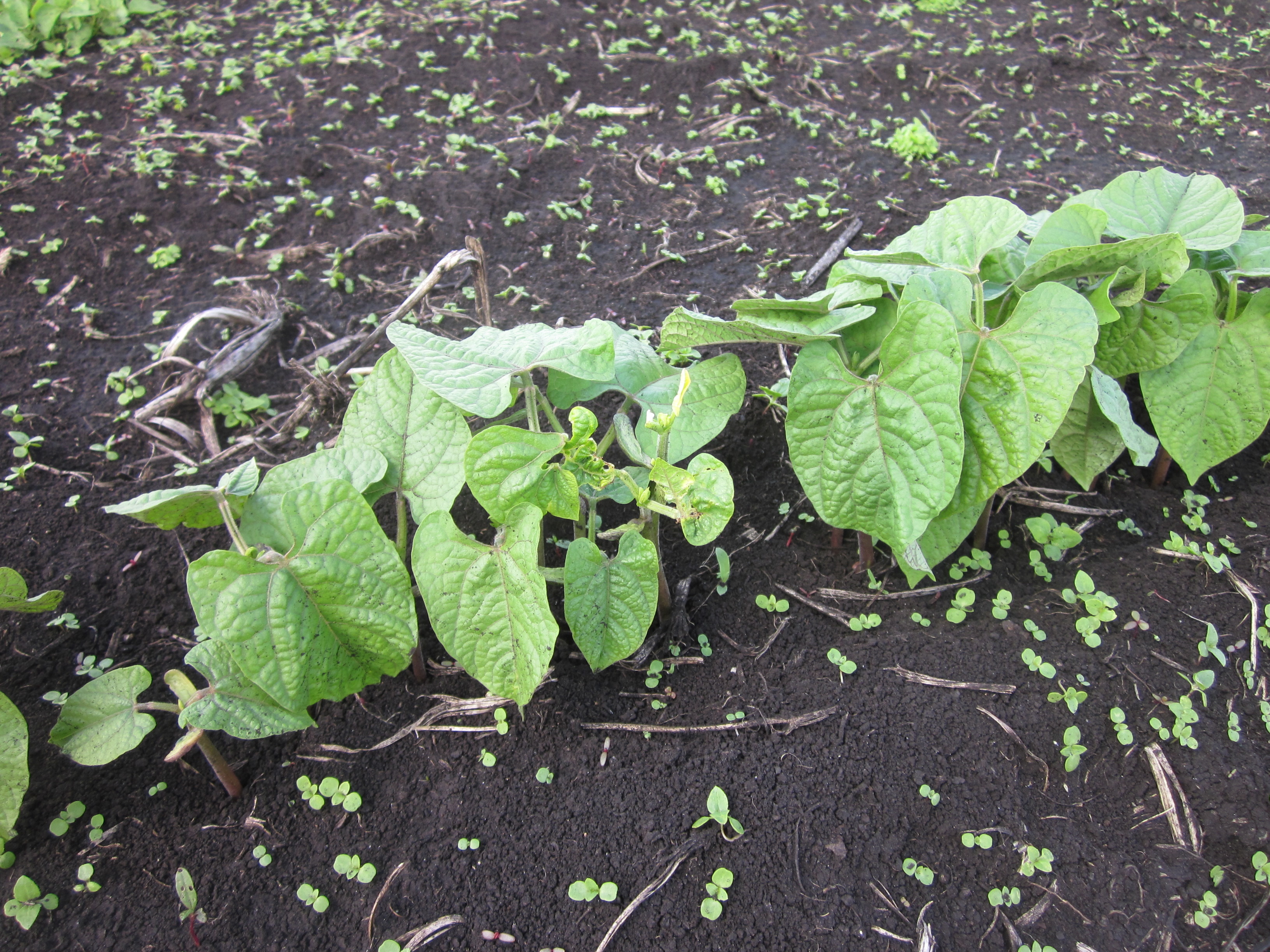 Beans are showing strong growth. Bush beans do not send up vines, so there is no work to put up a trellis. The yard long beans are popular in asian cuisine, and have a drier texture than string beans.