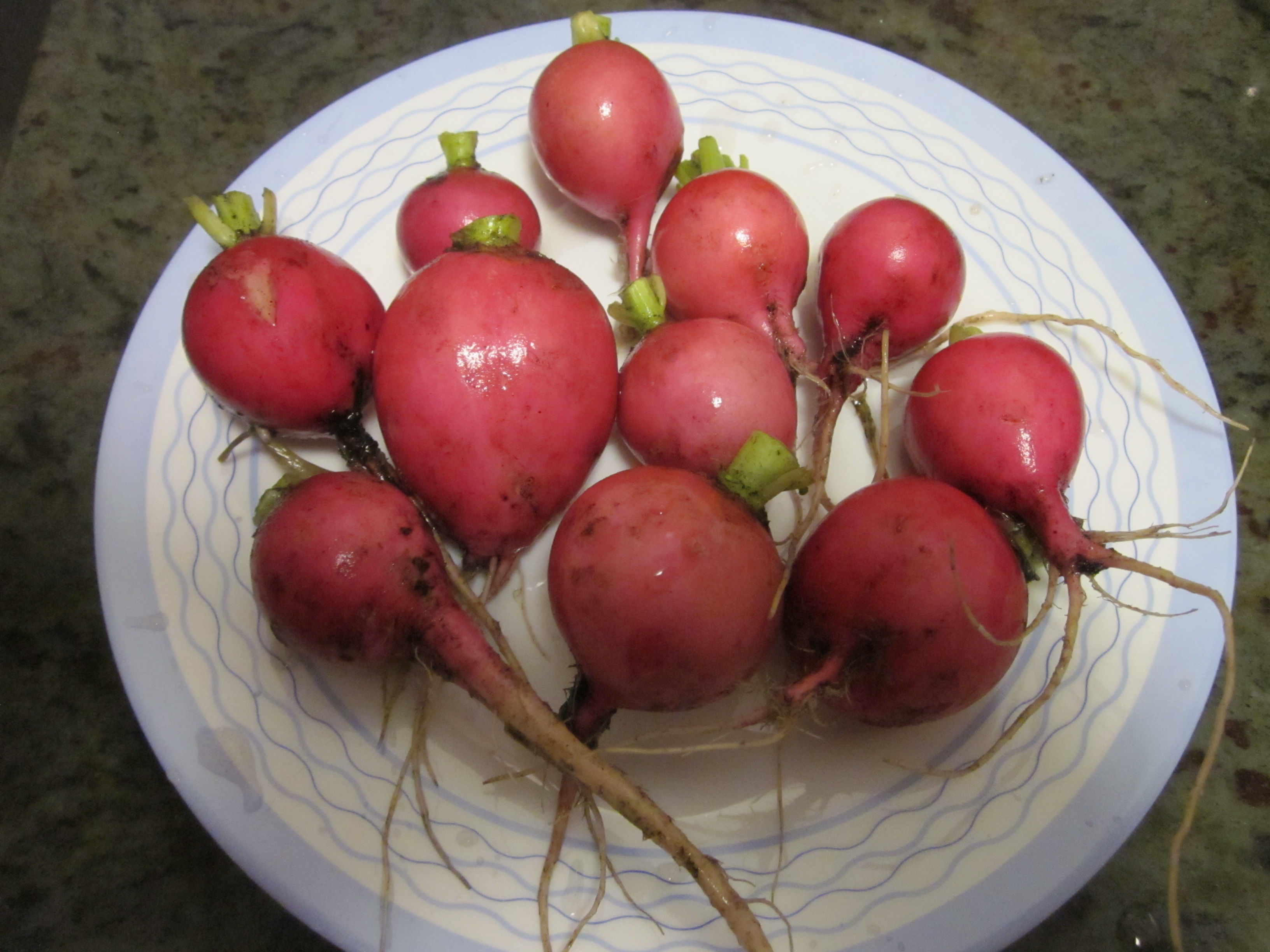 I remembered to check on the beets before finishing up and found some golf ball sized beets. These Chioggia beets are an italian heirloom from the Venice area, and show beautiful concentric rings of red and white. They were seeded on 4/19 and were supposed to be ready in 55 days, about 6/13. 2 weeks late seems about right for this season.