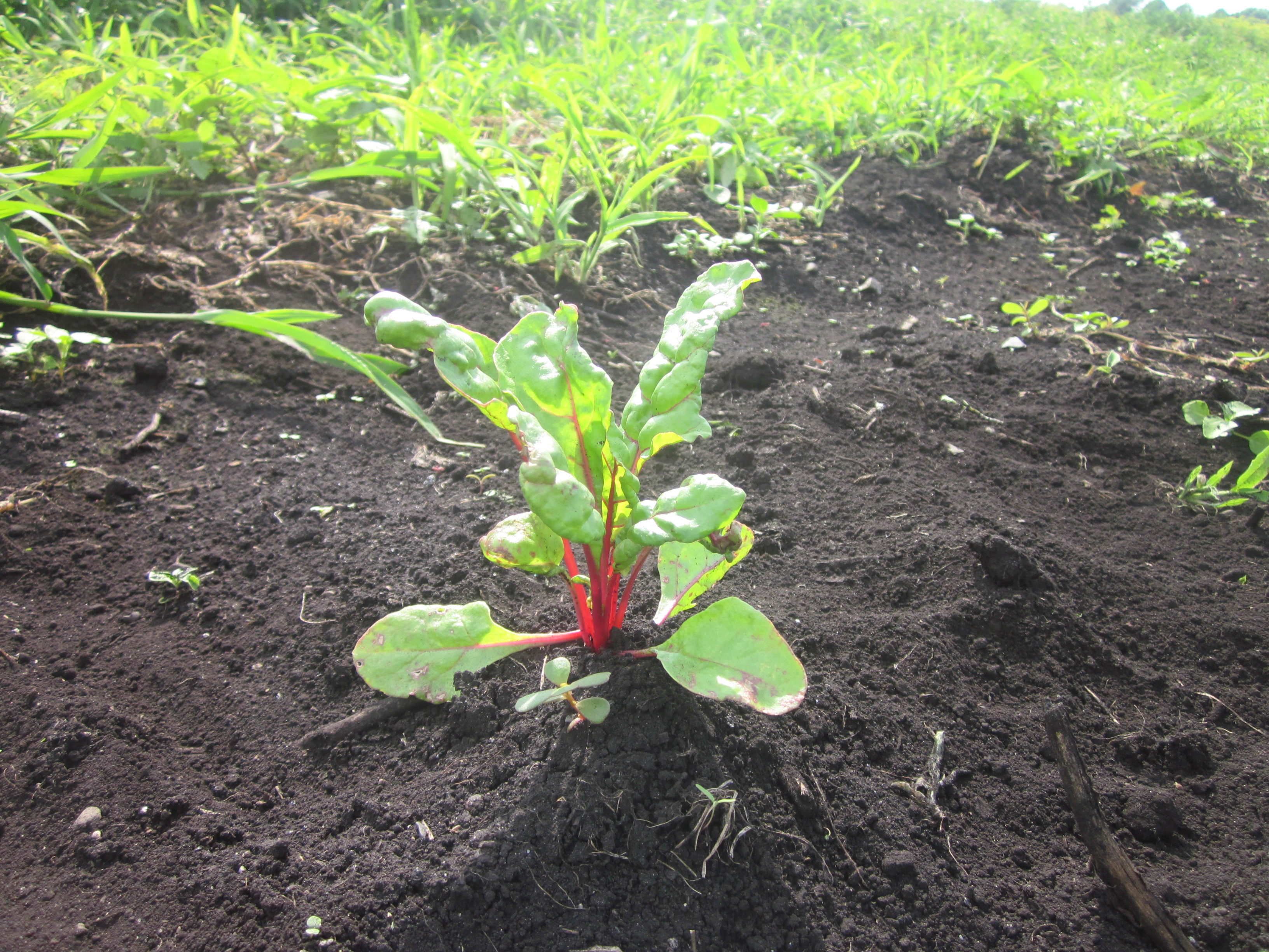 Rainbow chard regaling in hand-weeded row. Dan claimed he couldn’t tell the weeds from the chard, but after 10 minutes, he gained his vegetable eyes!