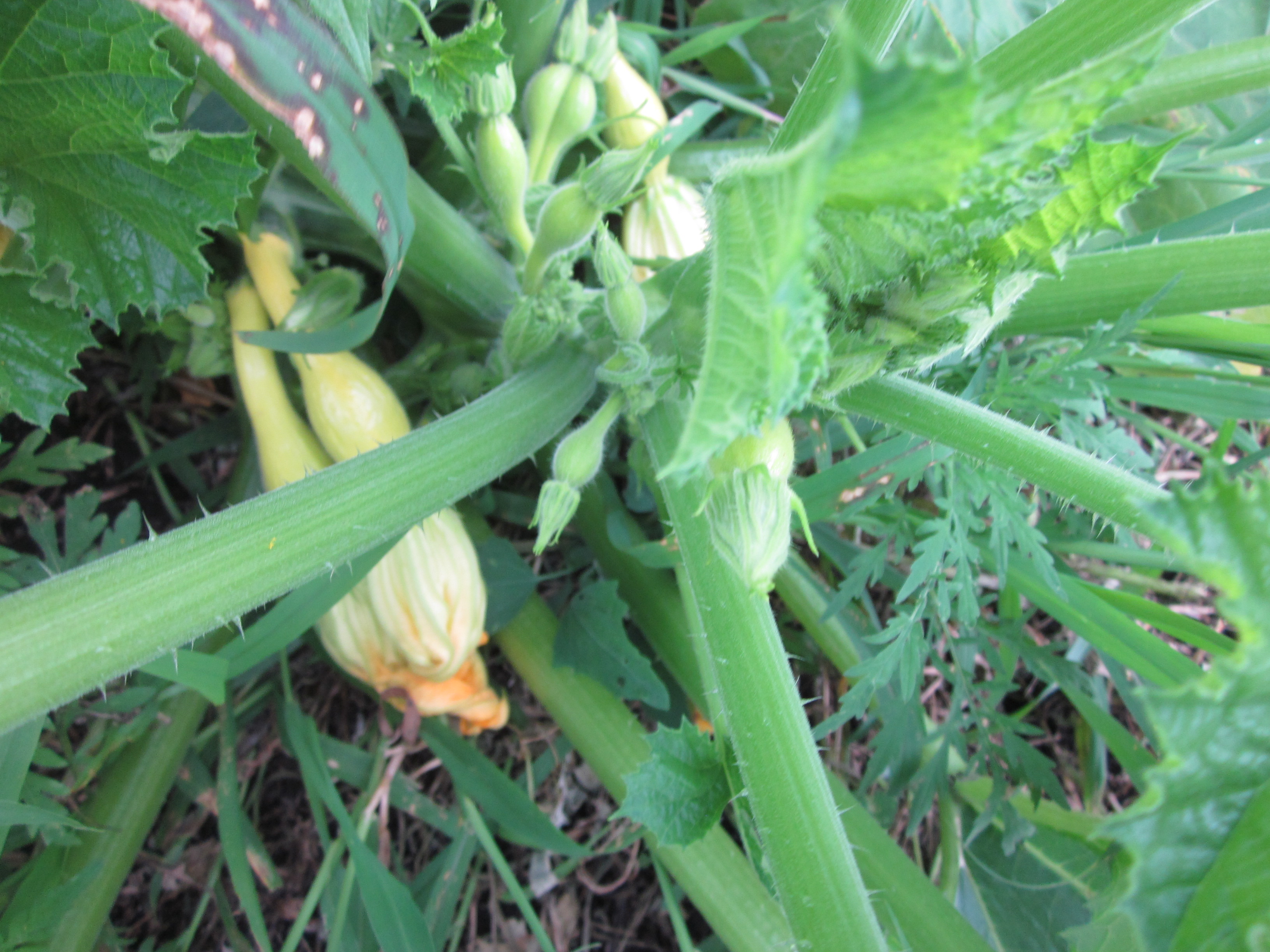 The summer squash “Yellow crookneck” greeted me with plenty of flowers and only half a dozen fruits. From the look of the immature plants, they will surely greet me next weekend. The yellow pattypan squashes are also blooming well, however the green pattypans are looking a bit gangly, possibly due to excessive weed pressure.