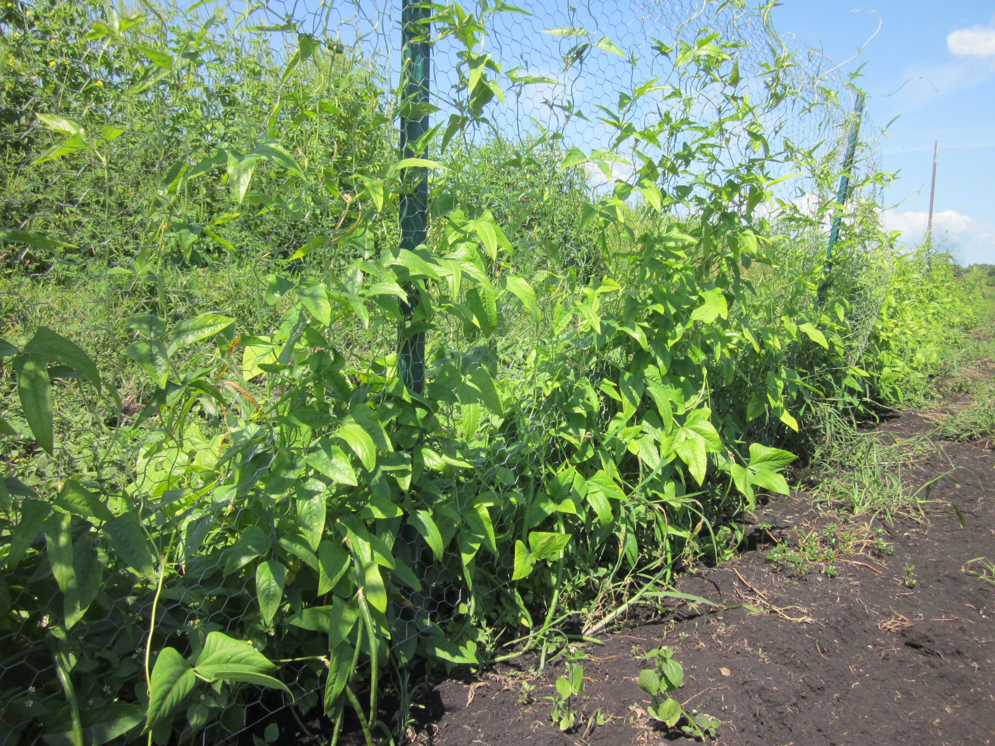 The yard-long beans took seemingly forever to reach for a trellis. Then suddenly they are spiraling out of control. We jerry-rigged leftever trellis, 1-in netting, chicken wire, and old fashioned string, up to the height of the stakes, which is about 4.5 feet. These beans can go to 8 feet… I will need more height.