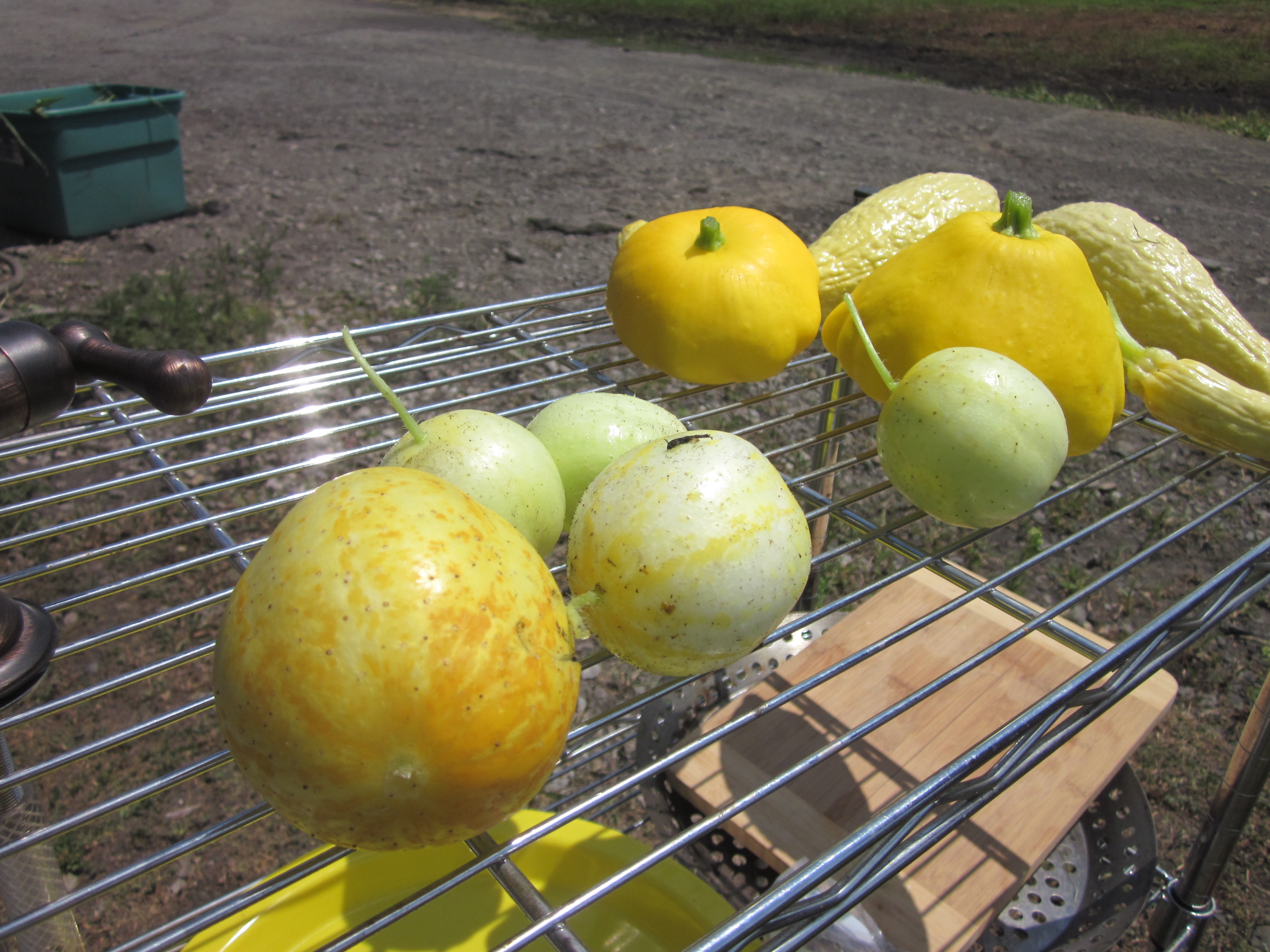 Summer cucurbits ready for eating. Lemon cucumber, in skin color and shape only, it does not taste like a lemon. Pattypan squash and crookneck squash.
