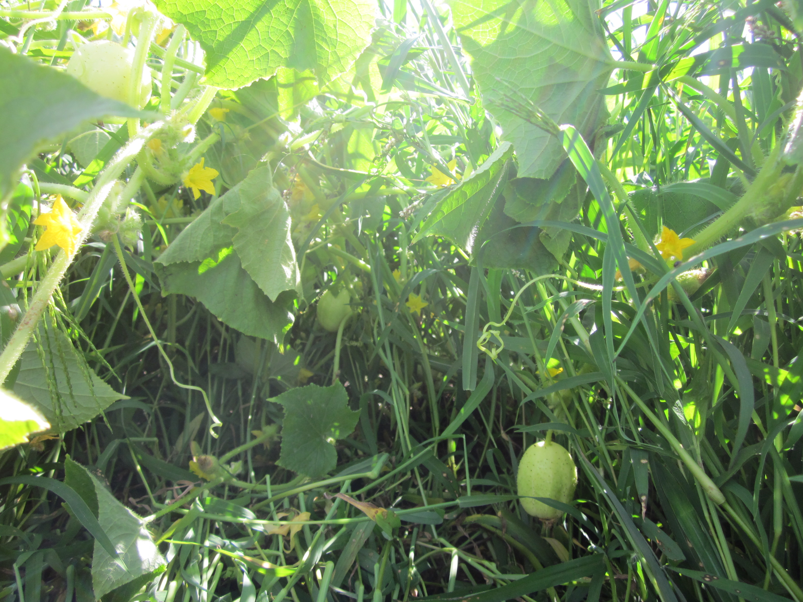 The lemon cucumbers started in earnest. I have taken to leaning cattle fencing (very large wire nets) against several stakes and pulling the vines off the foot-high grass. It isn’t the neatest sight, but it did help me find some hidden fruits. The varietal is shaped like a lemon and when fully mature are yellow as well. They are a mild cucumber with very little of the bitter compound cucurbitacin.