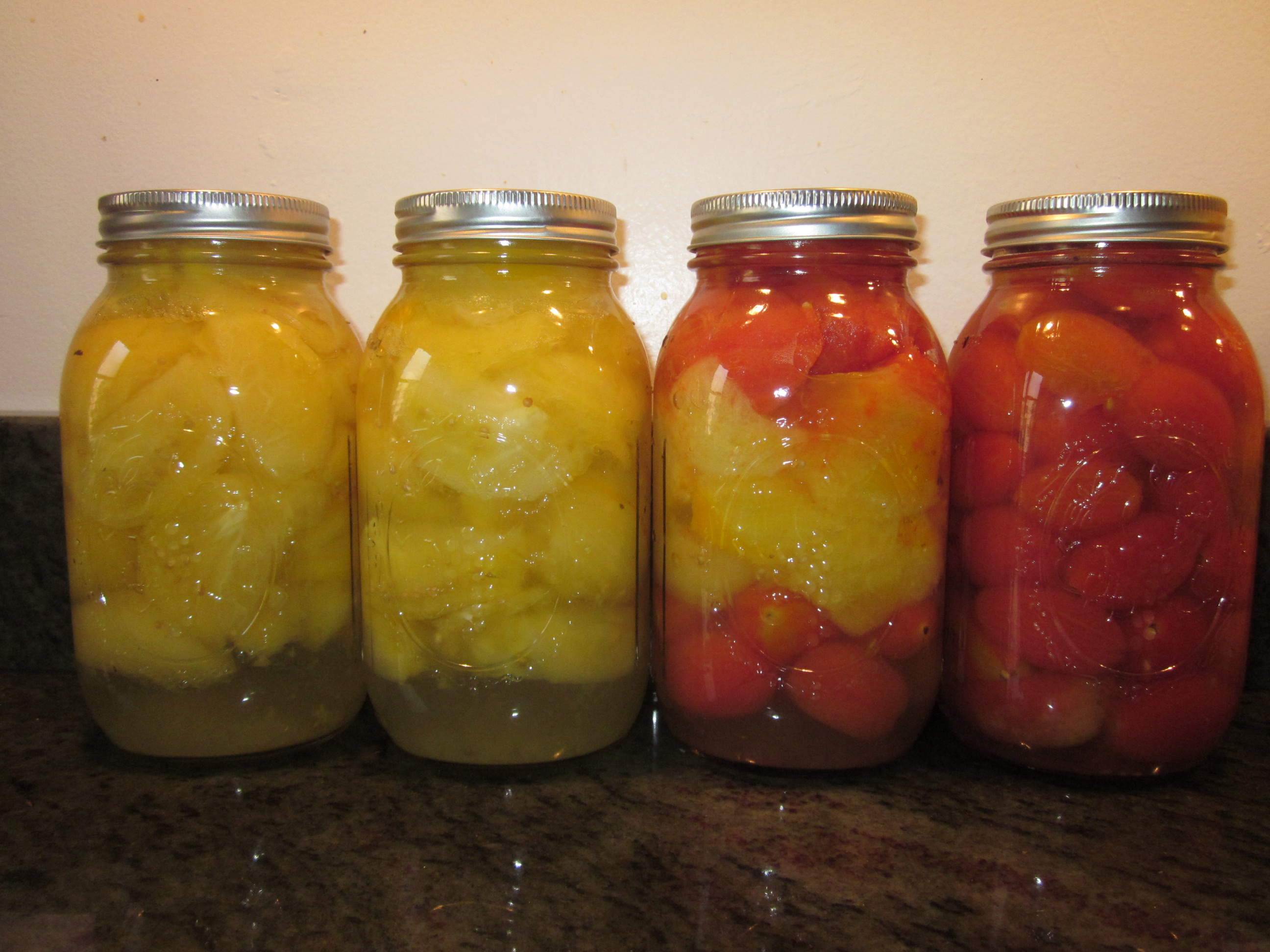 Produce as birthday party favors? Yup, we did that last weekend. With the excess not quite ripe, I gave it a few days on the counter, and decided to can it. And so I present Lot 1 of the 2014 tomatos. Yellow tomato’s are lower in acidity, so these are all preserved with 2Tbl lemon spoon per quart. (I’ll be trying 1/2 tsp citric acid for the next batch.)