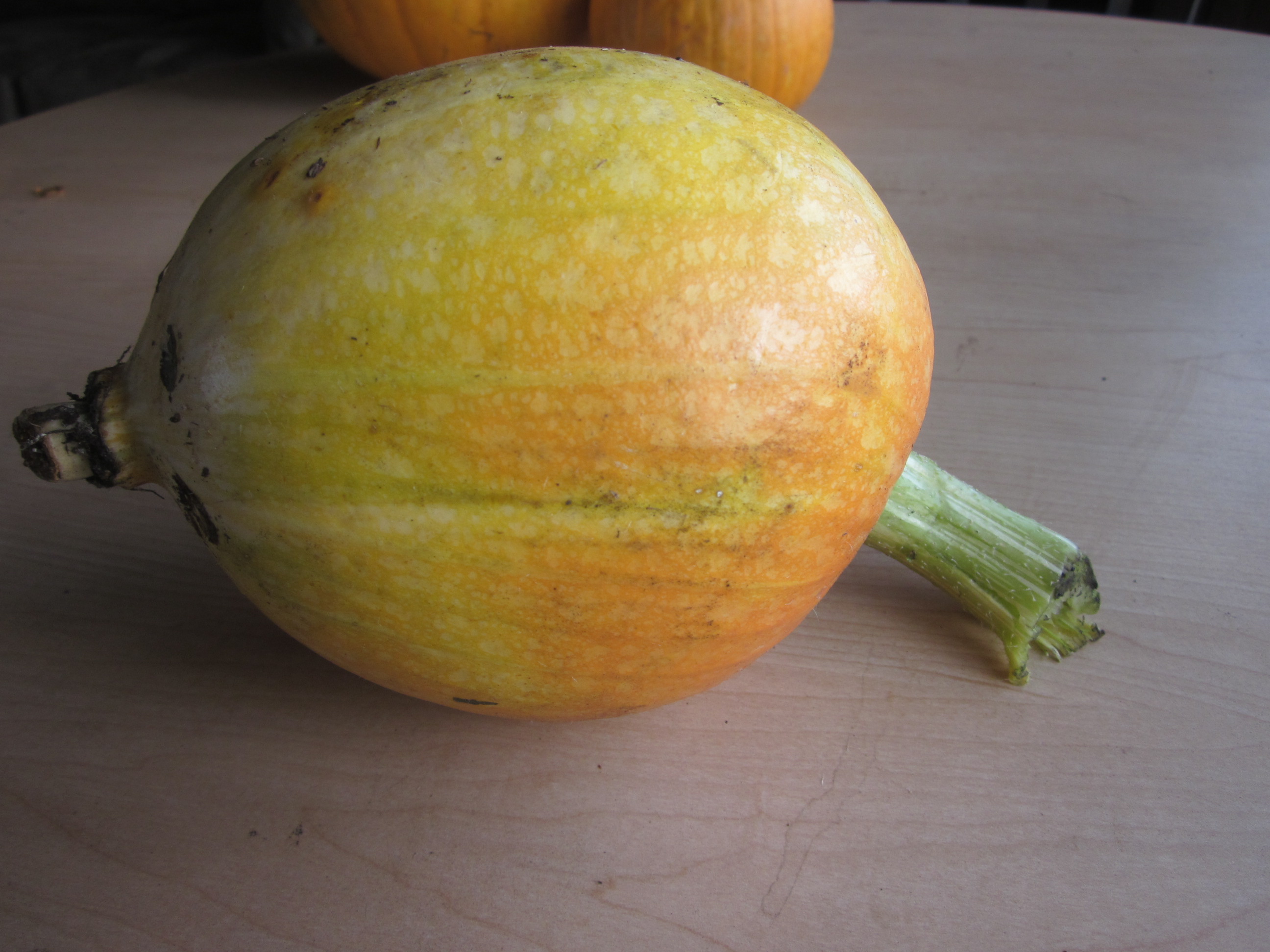 The one and only Amish Pie pumpkin. There were a few immature fruits that set recently, and the plant is still flowering.