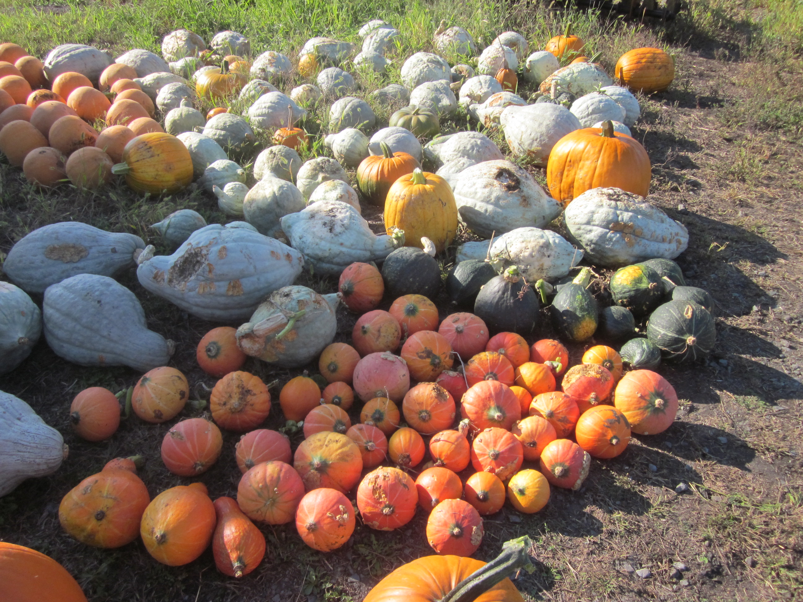 Blue hubbards curing in the field since last week, with newly collected pumpkins other orange squashes. The dark green are a hubbard-type squash called Anna Swartz. Leaving them outside to cure is a bit of field roulette, maybe the woodchucks will come for them, maybe the frost will descend upon us.