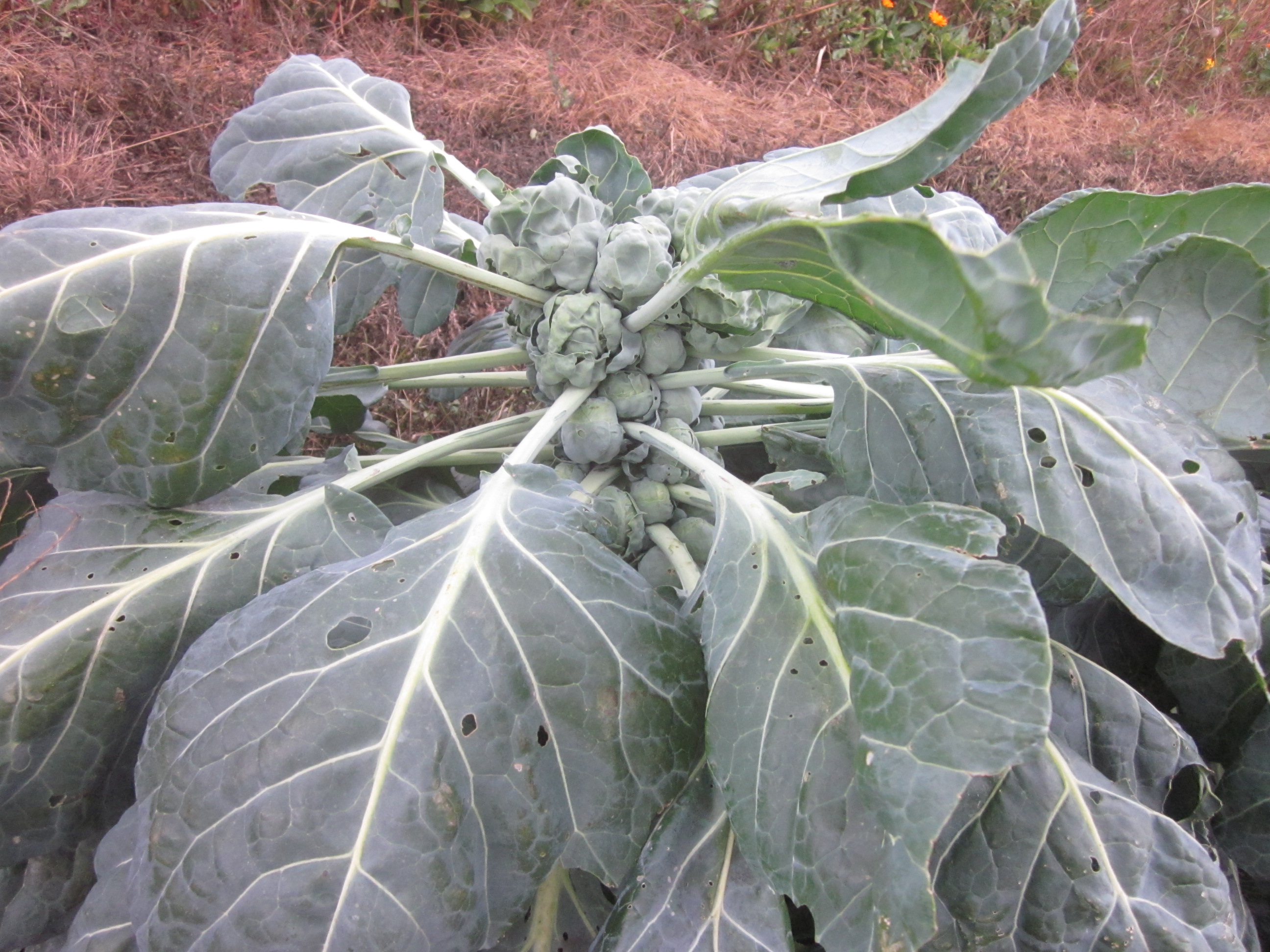 A nice fall crop of brussels sprouts, which can survive some cold. These stalks are like the leaning tower of pisa. The top layer of bud growth is amazing, flowering into additional buds and shoots.