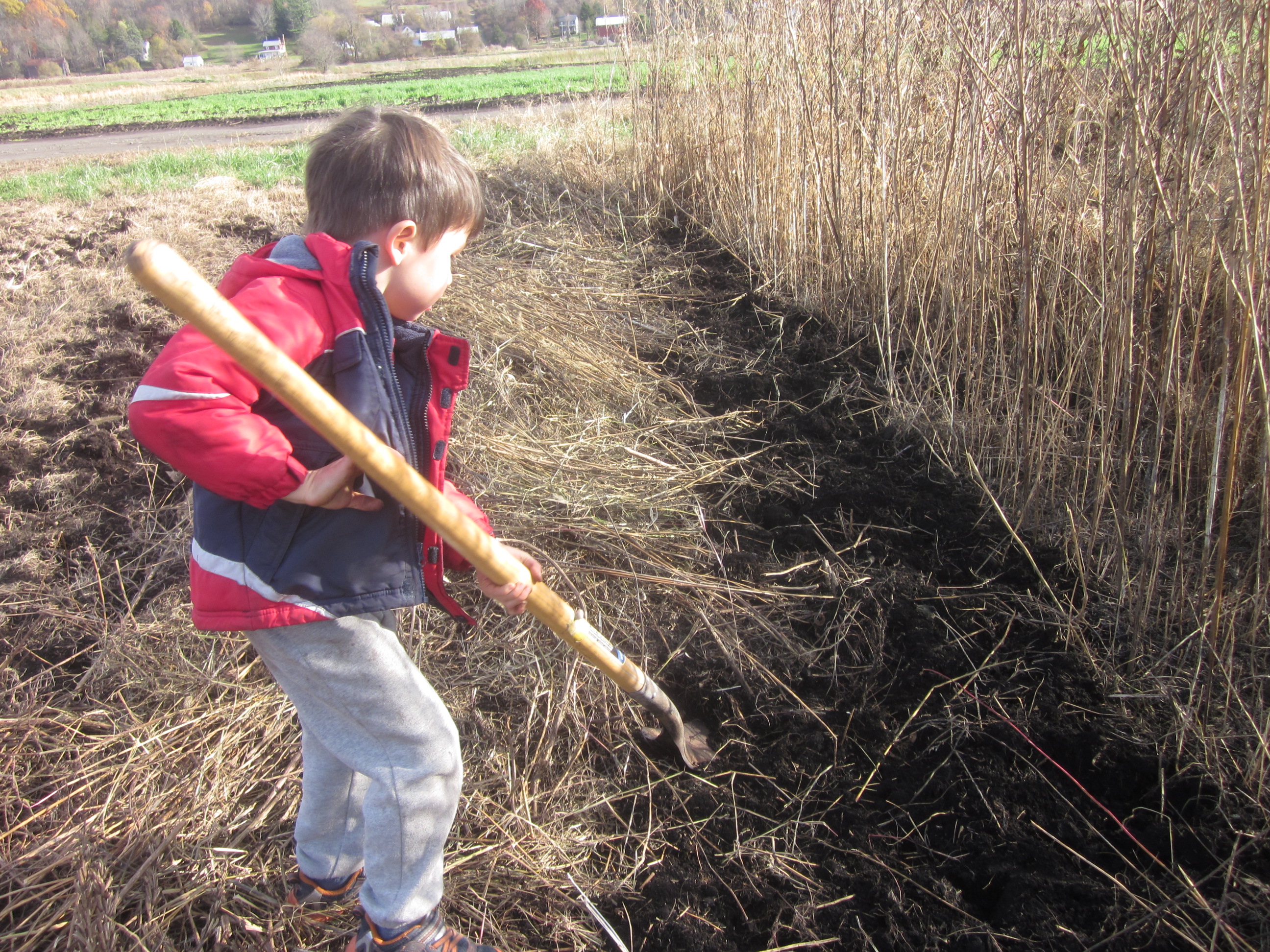 The drainage ditches were left untamed over the summer, and now the withered weeds provide a sort of windbreak. As I walked along the outermost ditch, I spotted 2 stakes marking potato rows. My heart skipped a beat. I had completely given up when the weeds overtook the plants in late May. It was on my list of to-weed, but something else always had higher priority. I thought the entire field was already broken up, and yet the stakes stood. We grabbed a pitchfork and a shovel, and eyeballed where the first line of potato would have been. Voila!